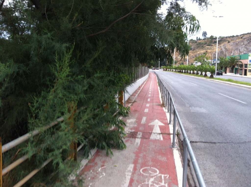 Δέντρα και κλαδιά μέσα στον ποδηλατόδρομο, καθώς πιάνουμε τα Πευκάκια, αμέσως μετά τα φανάρια.