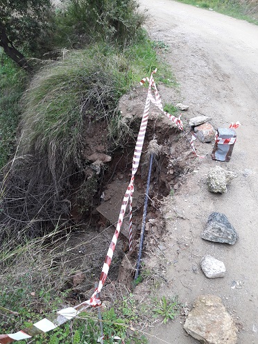 Ιδίως στο σημείο όπου η κοίτη τοπικού ρέματος διασχίζει τον δρόμο, μεγάλο μέρος του δρόμου υποχώρησε και τώρα υπάρχει ένα χάσμα, το οποίο μπορεί να γίνει ανά πάσα στιγμή επικίνδυνη “παγίδα” για διερχόμενο όχημα ή πεζό.