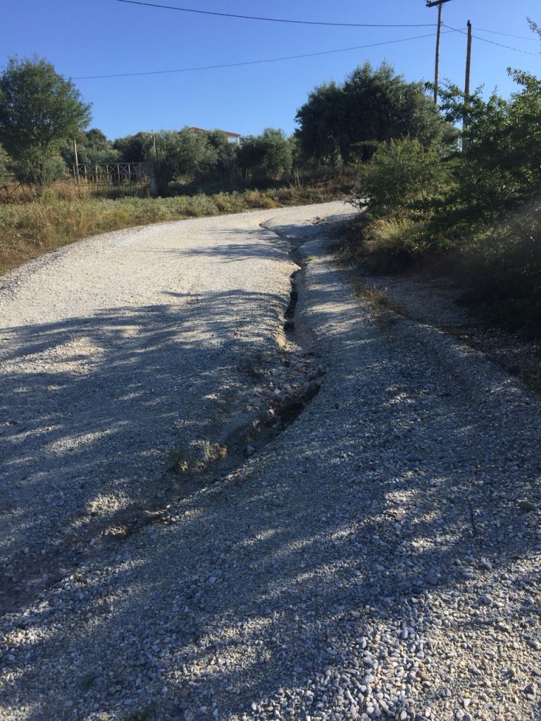 Το έργο σταμάτησε το 2010 και από τότε μετά από κάθε νεροποντή αναγκαζόμαστε οι κάτοικοι που εξυπηρετούμαστε από τον συγκεκριμένο δρόμο να πληρώνουμε μηχάνημα για να μας ισιώνει τον δρόμο .