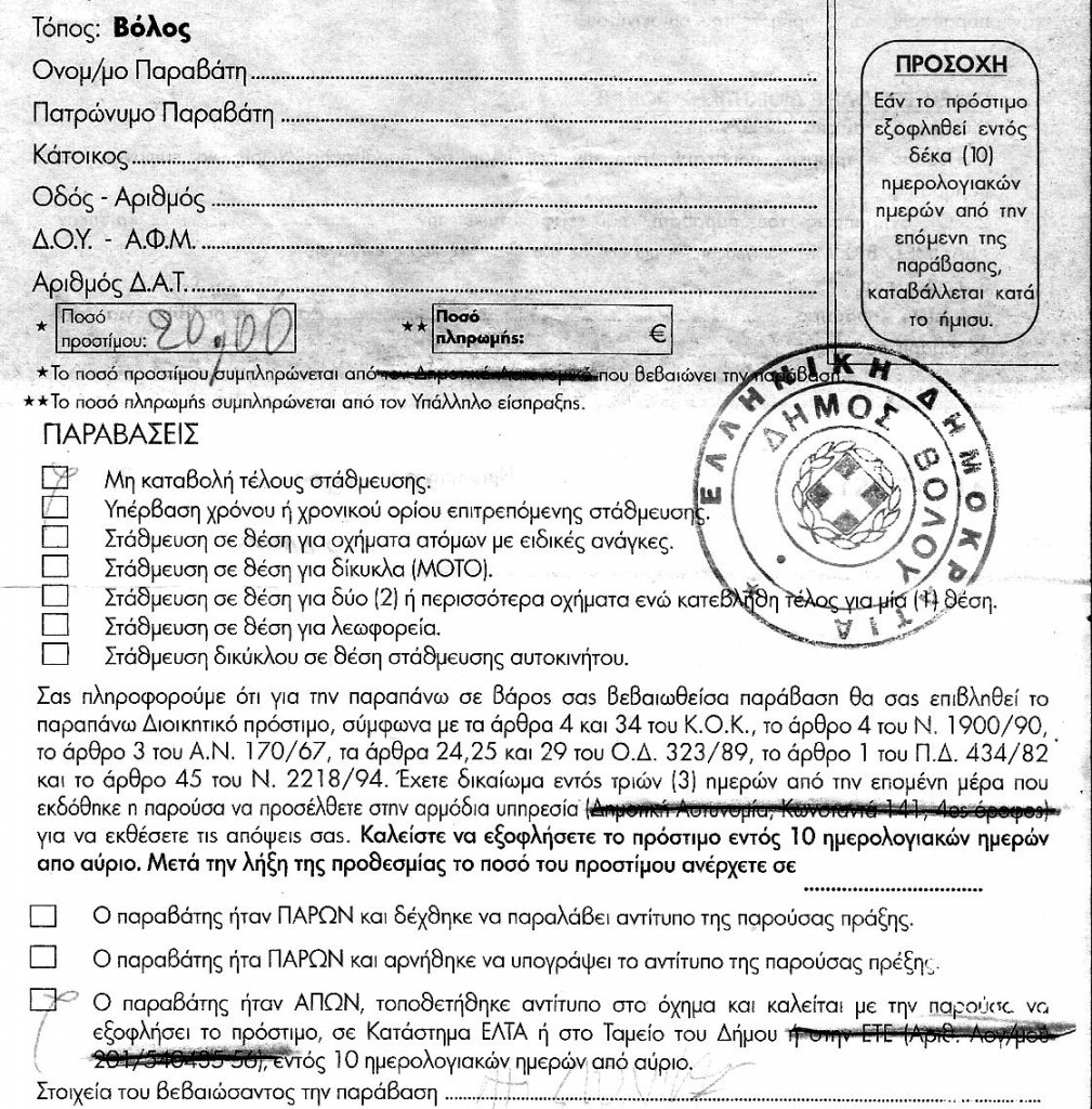 Σας επισυνάπτω φωτογραφία με κλίση, για μη καταβολή τέλους στάθμευσης ΜΕ ΣΦΡΑΓΙΔΑ ΑΠΟ ΤΟ ΔΗΜΟ ΒΟΛΟΥ με ημερομηνία ΦΕΒΡΟΥΑΡΙΟΣ 2015 και με υπογραφή από ΔΗΜΟΤΙΚΟ υπάλληλο .