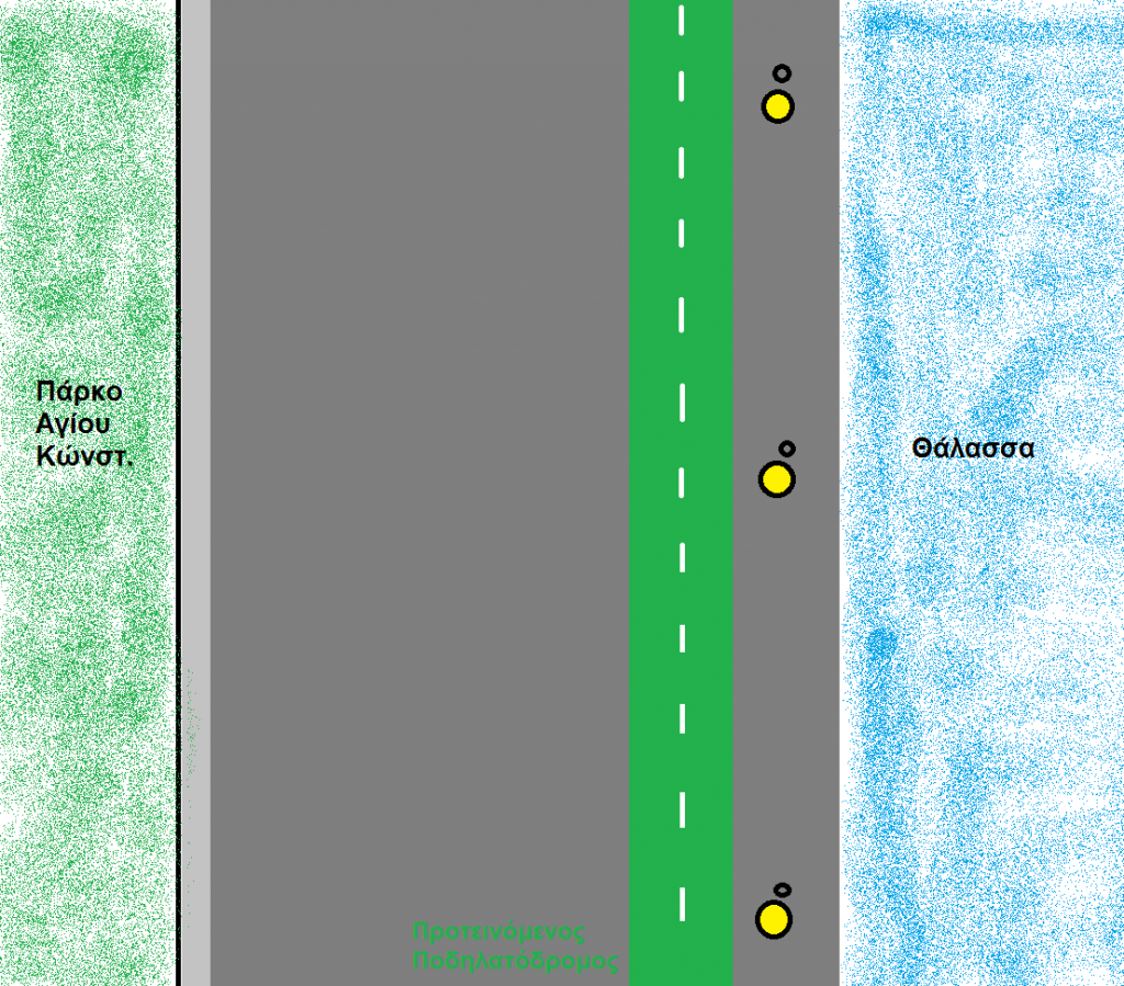 Θελω να προτείνω μια ευκολη και φθηνη λυση για την κινηση των ποδηλατων στην Παραλια μπροστα στο παρκο του Αγιου Κωνσταντινου αλλα και στην υπολοιπη Αργοναυτων. Προτεινω οπως στο σχεδιο παρακατω την διαγραμμιση ωστε να κινουνται τα ποδηλατα ελευθερα σε αυτη την λωριδα χωρις πεζους η καποια αλλα εμποδια. Στην Αργοναυτων υπαρχει ηδη διαγραμμιση για τα οχηματα, θα μπορουσε να ολοκληρωθει με καποιες διορθωσεις ωστε να ειναι πιο καθαρες οι λωριδες. Τα ποδηλατα ειναι πολλα τα οποια κινουνται εκει και ο κοσμος επισης. Ειναι δυσκολο και καποιες φορες επικυνδυνο να αναγκαζονται τα ποδηλατα να κινουνται με ελιγμους για να αποφευγουν πεζους.