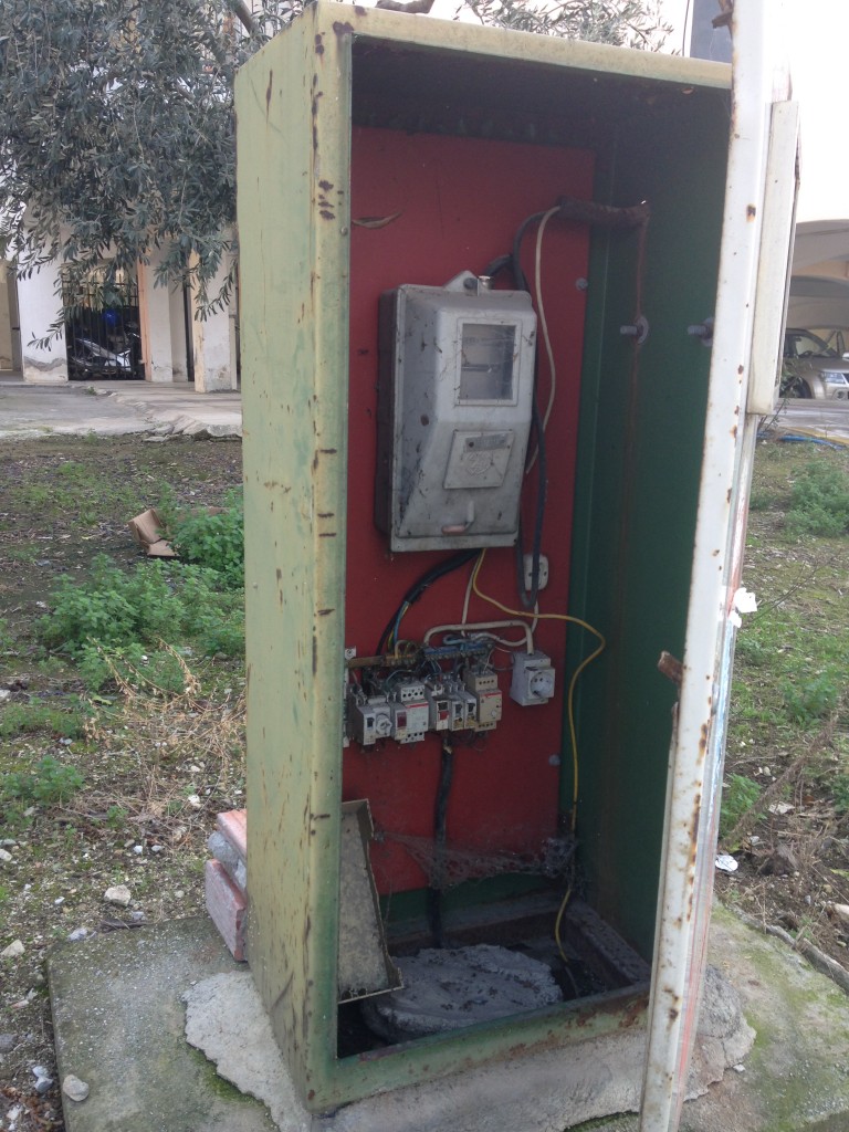 Η πόρτα έχει σκεβρώσει, με αποτέλεσμα όχι μόνο να μην κλειδώνει, αλλά ούτε καν να μπορεί να κλείσει πρόχειρα. Με ένα ελαφρύ αεράκι, ανοίγει διάπλατα και τα καλώδια εκτίθενται στη βροχή και στην περιέργεια των παιδιών…