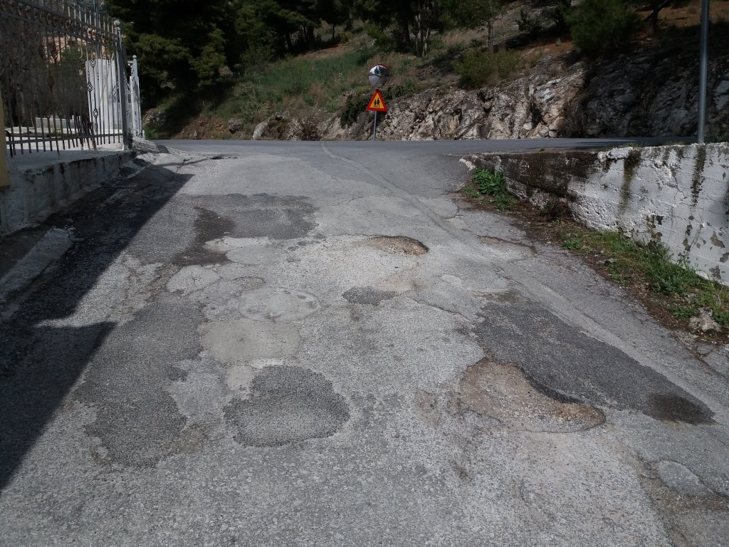 Είναι περίπου 10 μέτρα οδοστρώματος όπου ανοίγουν συνεχώς νέες λακκούβες. Στο παρελθόν έχουν κλειστεί κάποιες λακκούβες με πίσσα αλλά ανοίγουν νέες. Θα πρέπει να γίνει αντ/ση του οδοστρώματος σε αυτά τα 10 ölçmek.