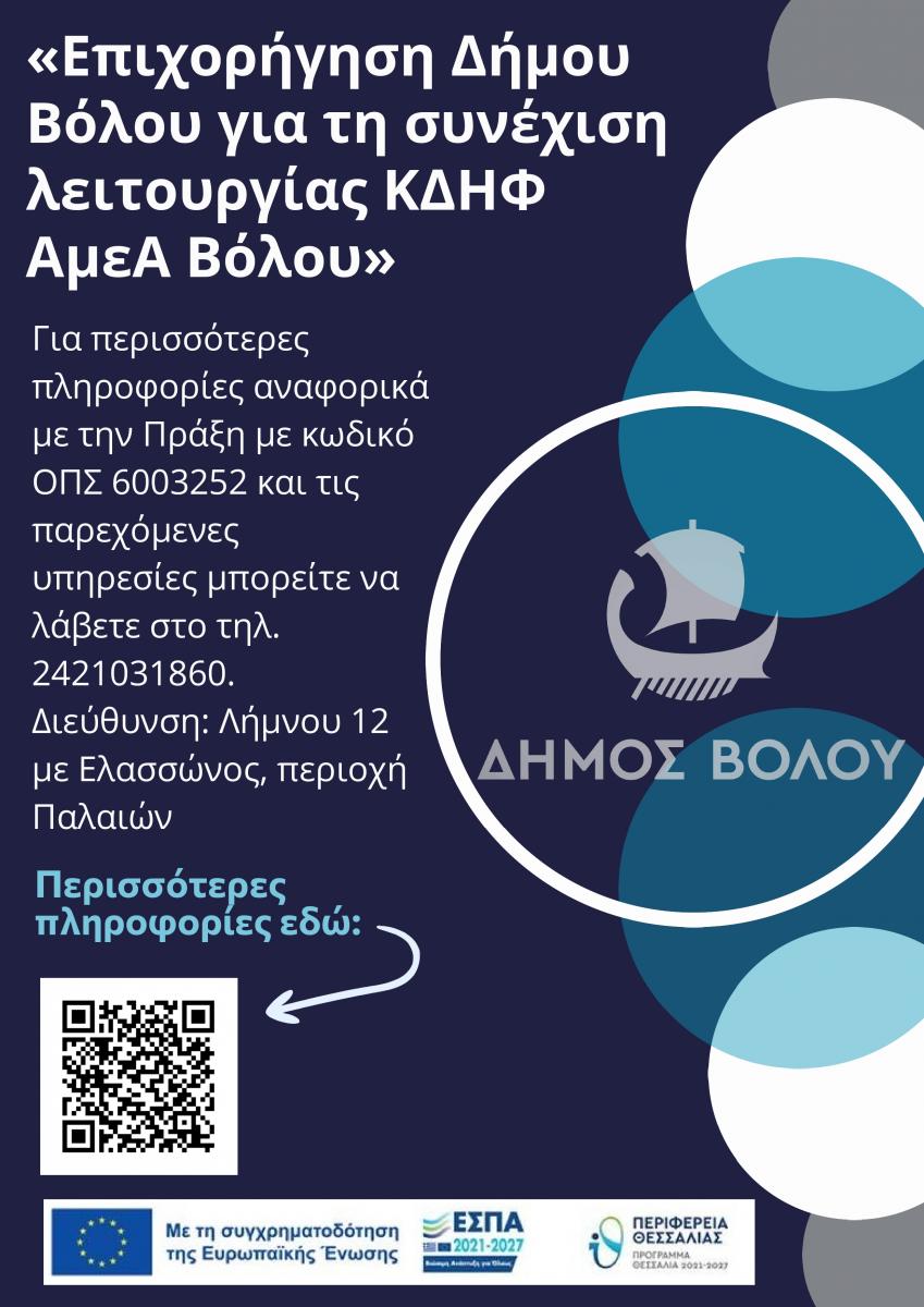 Ο Δήμος Βόλου, στο πλαίσιο της κοινωνικής του πολιτικής, υλοποιεί το έργο "Κοινωνικό Φαρμακείο" που συγχρηματοδοτείται από το Ευρωπαϊκό Κοινωνικό Ταμείο, μέσω του "Επιχειρησιακού Περιφερειακού Προγράμματος Θεσσαλίας 2014-2020".