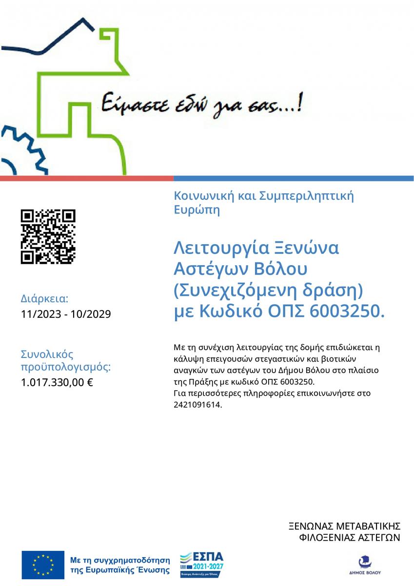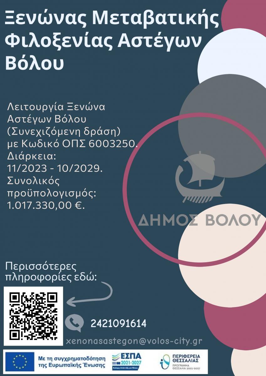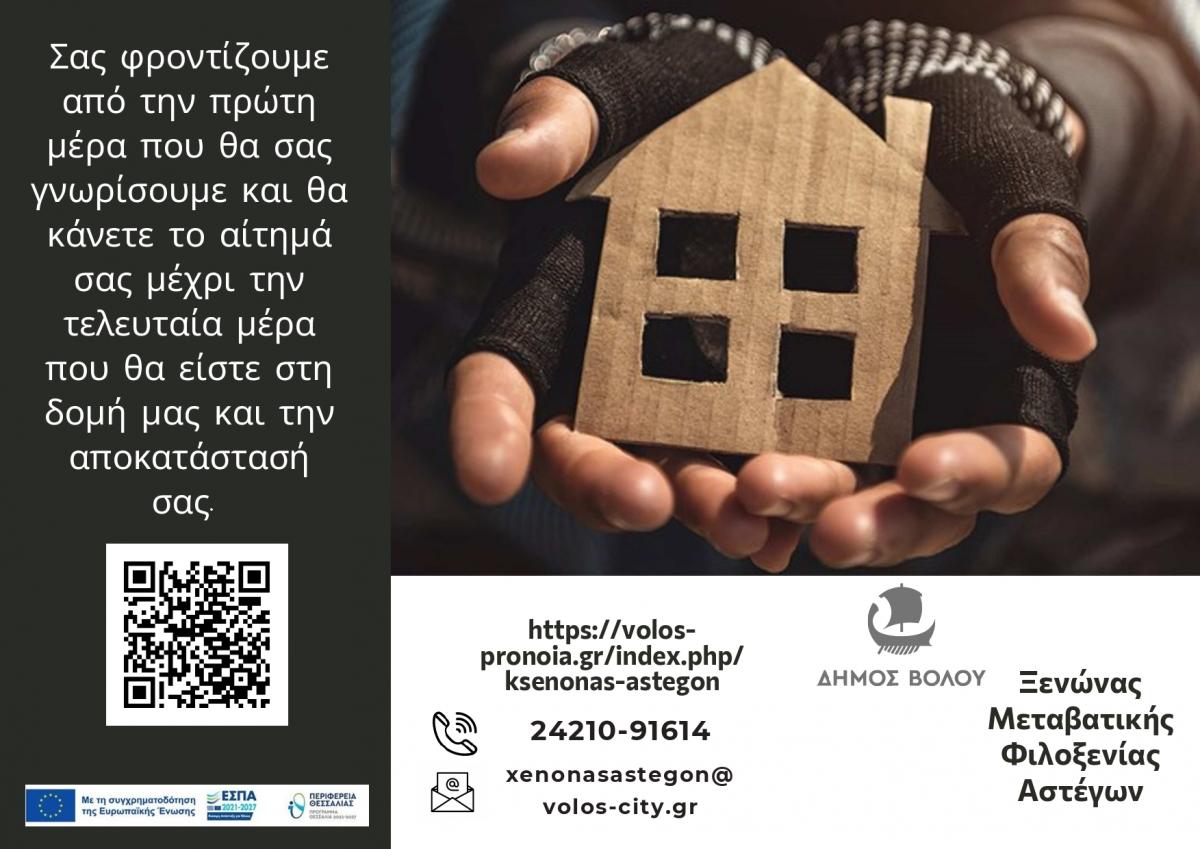 Ο Ξενώνας Φιλοξενίας Γυναικών-Θυμάτων βίας του ∆ήμου Βόλου λειτουργεί από τις 24 Σεπτεμβρίου 2013. Παρέχεται φιλοξενία σε γυναίκες-θύματα έμφυλης βίας μαζί με τα παιδιά τους, καθώς και εξειδικευμένες υπηρεσίες πληροφόρησης και συμβουλευτικής στους τομείς ψυχοκοινωνικής και νομικής στήριξης των γυναικών.
